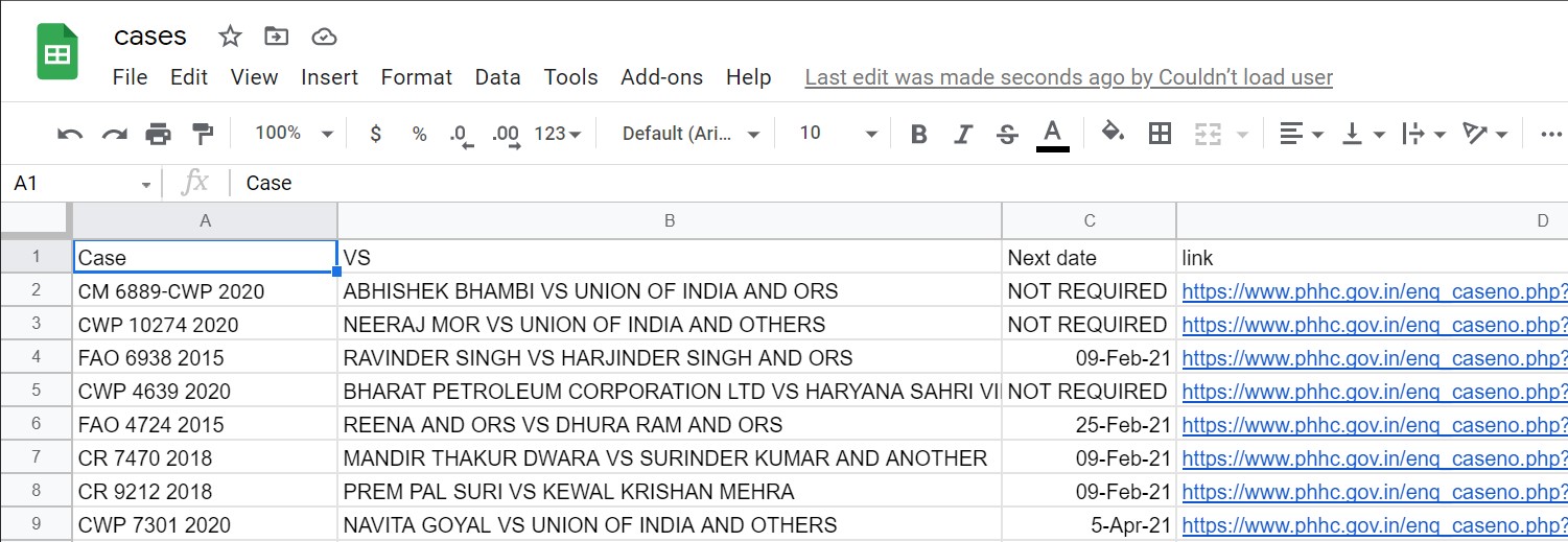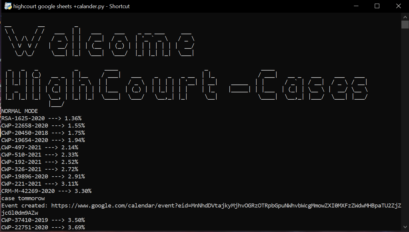 This was a python program I Wrote which did web scrapping on site of highcourt Chandigarh to gain info about different cases and then puts that into an excel file and also sets a reminder in google calander .I wrote this program to help my Mother and Father as they are lawyers. This program also deleted any repeated case entries, organised the case data in excel file neatly. It used Google's API's(calander and drive Api) .It used libraries such as Gspread , requests , pickle , google o-auth .