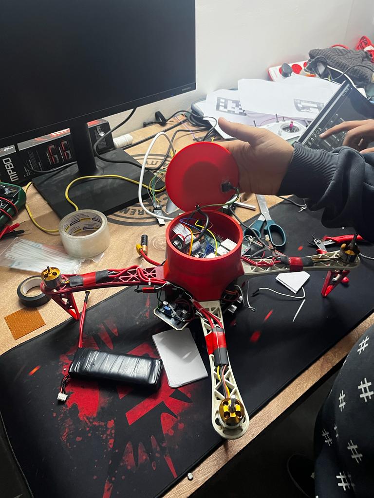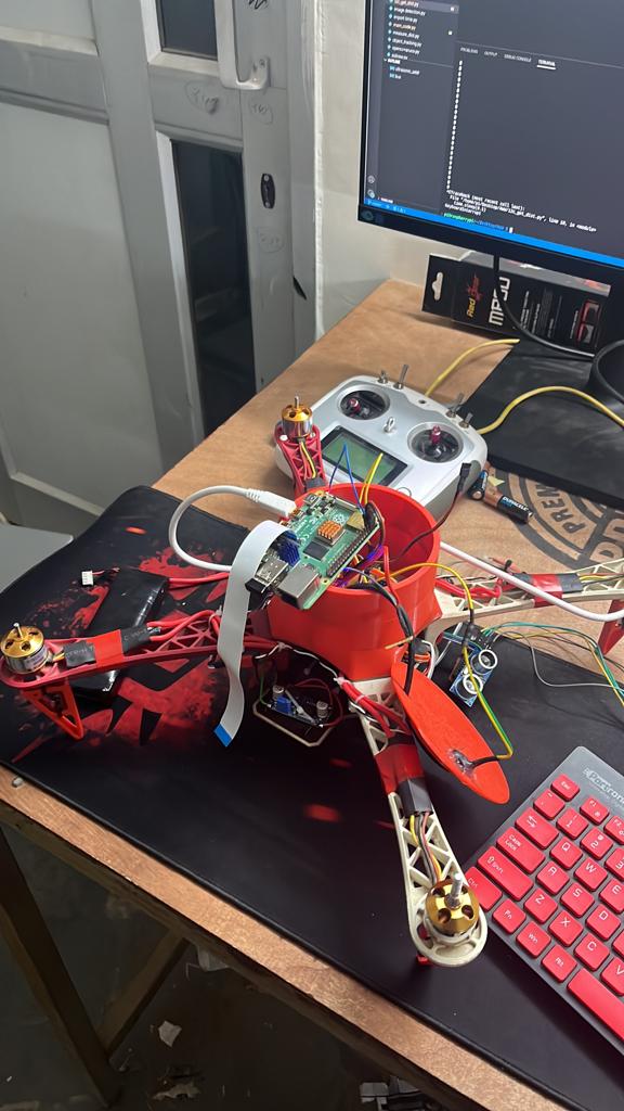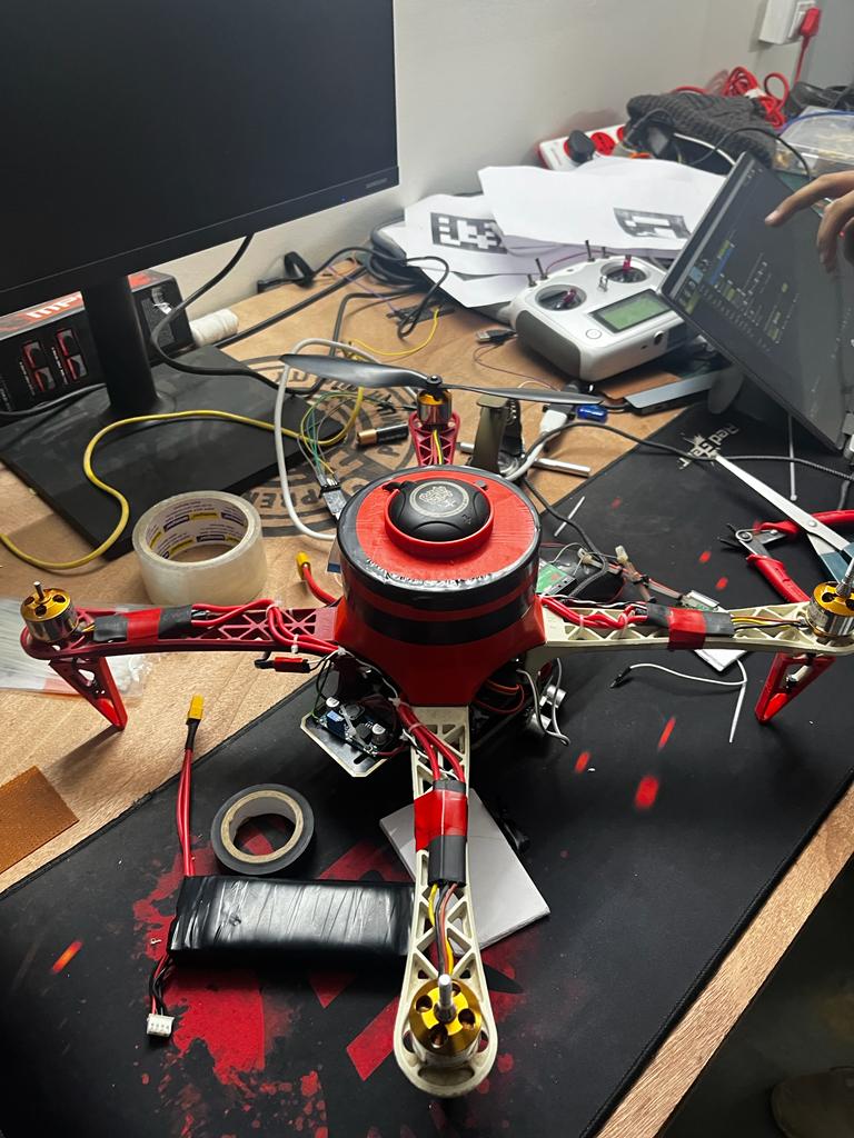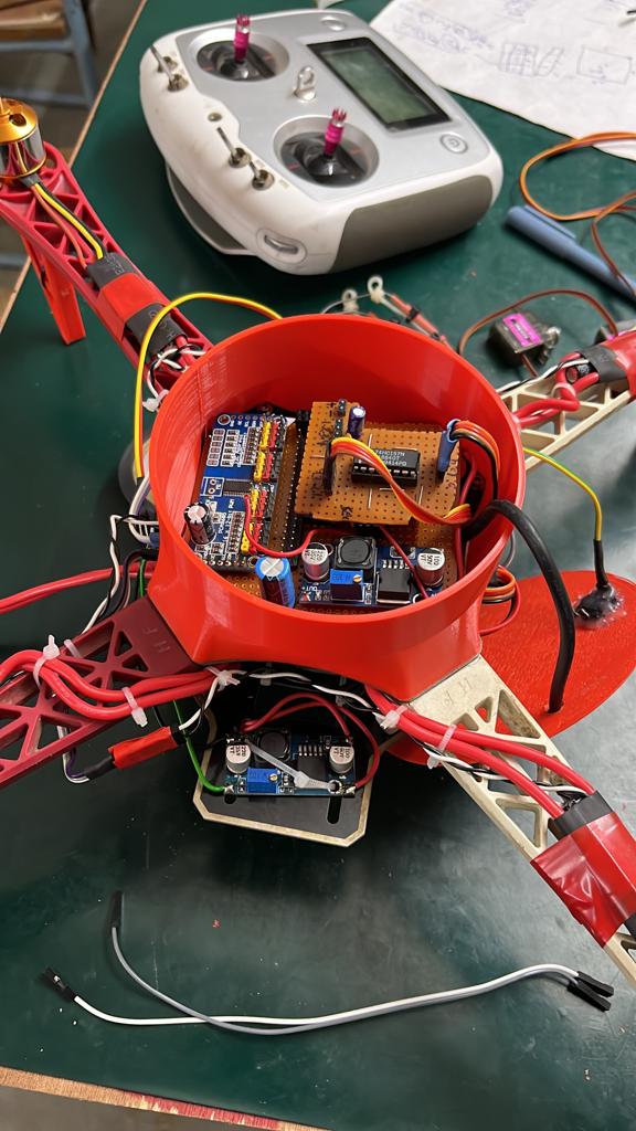 This was a drone made for the competition Flipkart grid 4.0 held in IIT madras. We were supposed to make a drone which could autonomously pickup and drop objects using aruco markers. We Firstly used a APM flight controller in combination with a raspberry pi 3 and made the raspberry pi 3 control the drone using PWM signals which are standard signals for many flight controllers. We switched between the PWM signals of the user and Raspberry pi using a mux with a duty cycle detector so that we could take control from raspberry pi wirelessly at any time. Later we left the APM flight controller and moved onto a custom FC using a teensy duino 4.0 for which we found a basic flight controller firmware online. We modified the firmware so that Raspberry pi could control it over I2C and it could receive height data over UART from 2 ultrasonic sensors connected to an arduino. Well you may ask Did we win the competition ? No we didn't , but did we learn and enjoy making that drone ? Absolutely Yes we loved it.